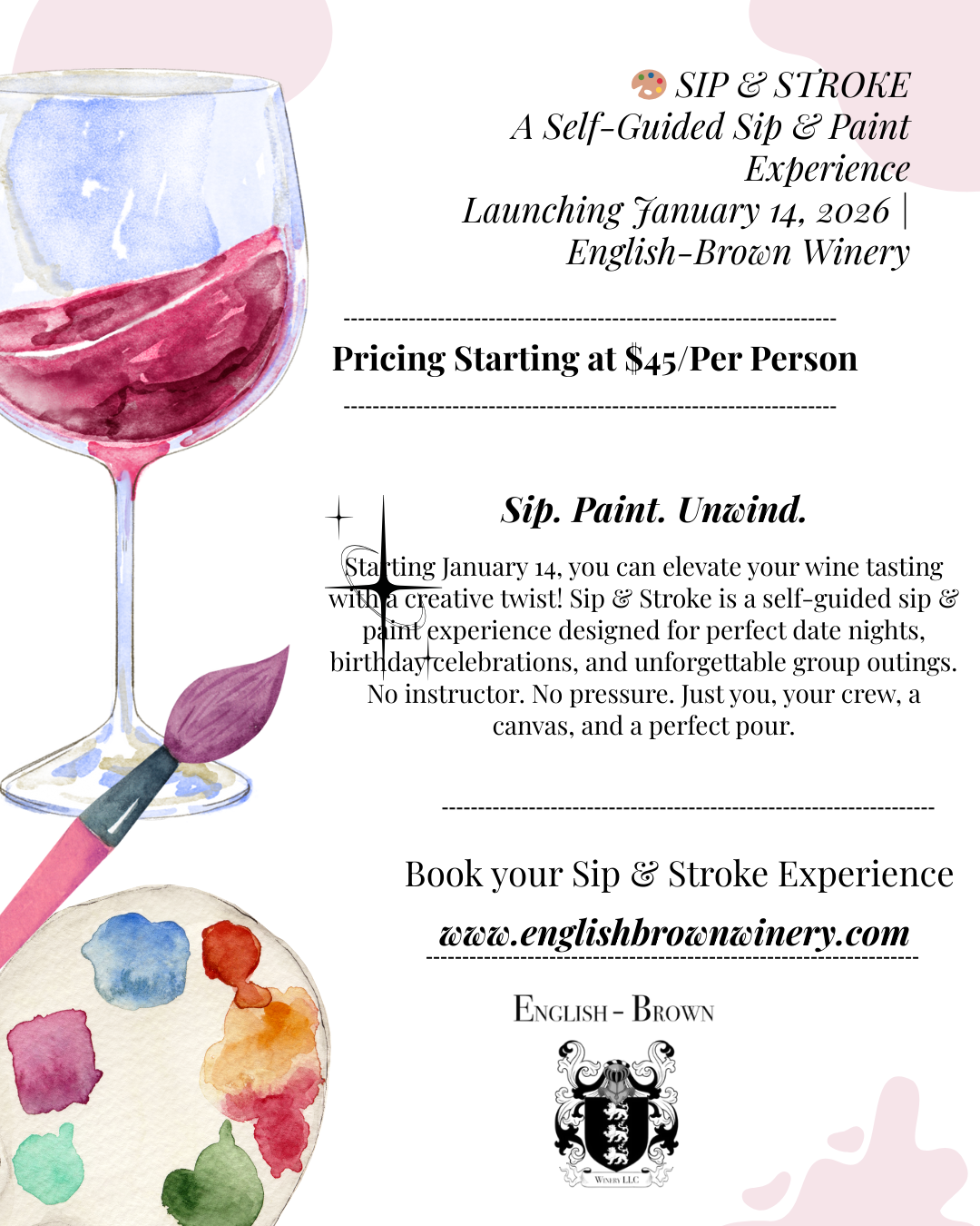Sip & Stroke – A Self-Guided Sip & Paint Experience at English-Brown Winery1 hr 30 min | multiple dates$45.00 / guest